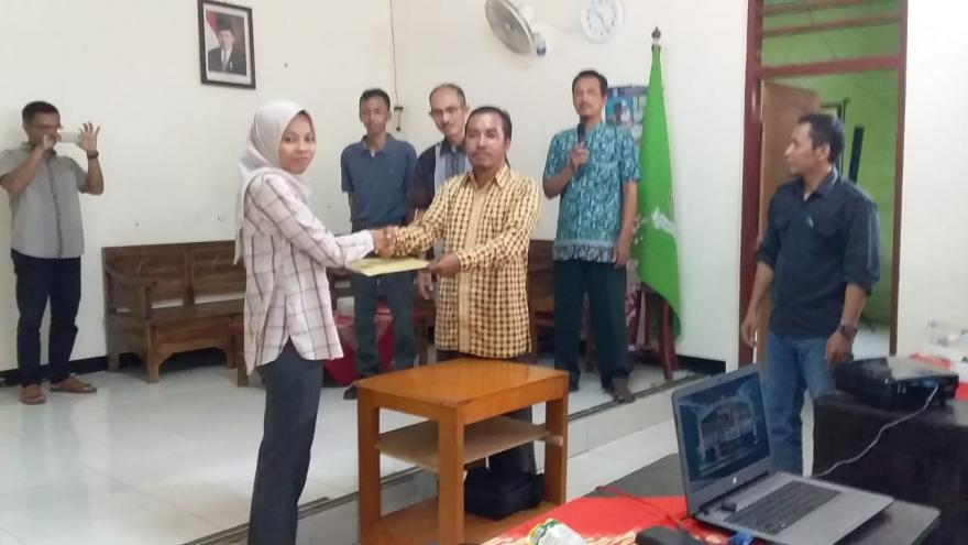 Setelah dilaksankan paparan, Tim Pelaksana Kegiatan menyerahkan hasil pekerjaan secara simbolis kepada Kepala Desa dilanjutkan penandatanganan Berita Acara Penyerahan Pekerjaan Tahun Anggaran 2018.