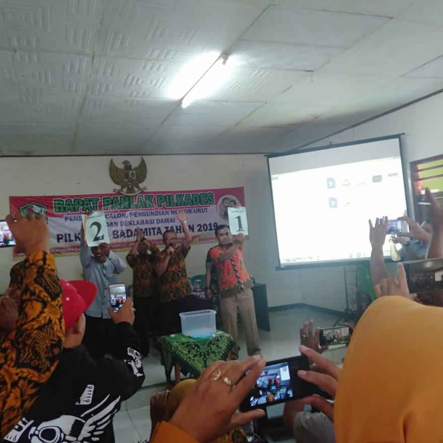 Penatapan Calon dipimpin oleh Ketua Panitia Pemilihan Kepala Desa Badamita Abdul Ngajid dilanjutkan pengundian Nomor Urut Calon Kepala Desa yang dimoderatori Ciptono selaku anggota Panitia Pemilihan. Pengundian dilakukan dengancara mengambil nomor undian yang telah ditempatkan dalam box transparan.